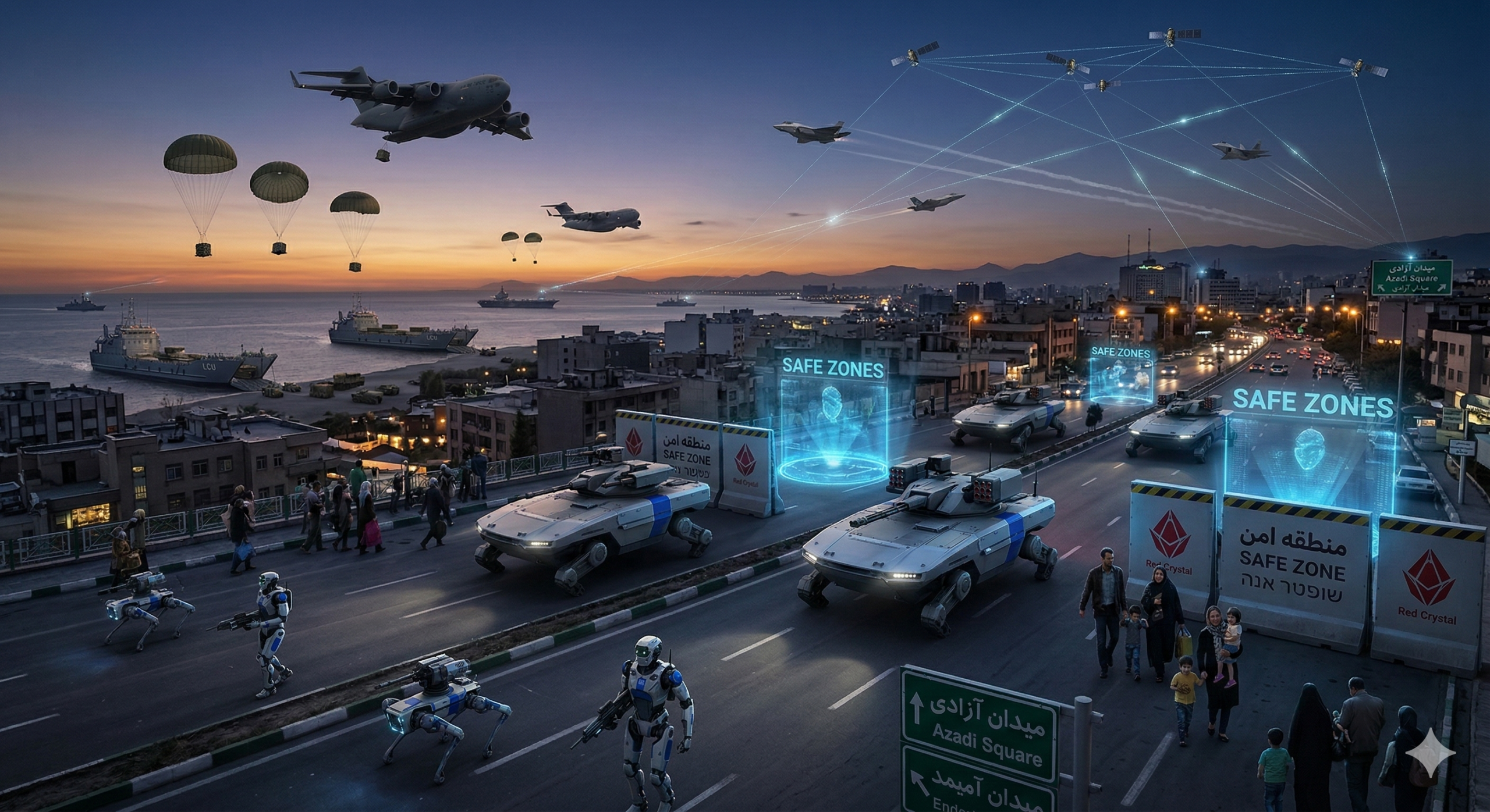 Upon the initiation of the robotic ground assault, the coalition will broadcast coordinates of pre-designated safe zones—such as urban parks, hospital complexes, or large sports stadiums in Tehran—and invite civilians to take shelter.34 These zones will be defended by a “smart” robotic perimeter: